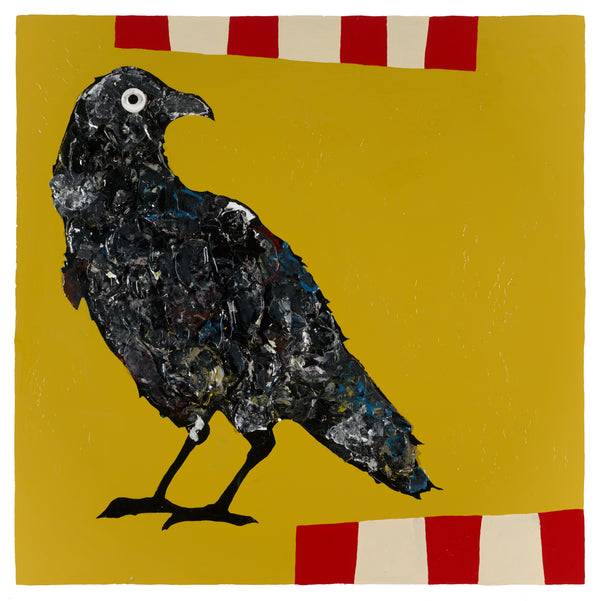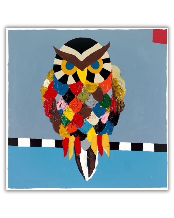 His oil paintings on board—primarily 40" x 40" in recent years, with earlier work at 48" x 48"—are bold, direct, and built to hold a room. High-gloss finish gives them an almost industrial quality. Visible brushwork reveals the human hand beneath.