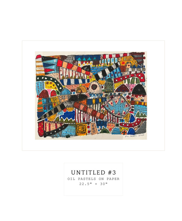 The drawing practice began in the late 90s and has continued alongside the paintings ever since. His most recent series, The Deliberate Spontaneity of Mark-Making, is oil pastels on Stonehenge paper, 22.5" x 30". Each piece takes shape through what he calls "slow accumulation," building marks over days or weeks until the composition resolves.